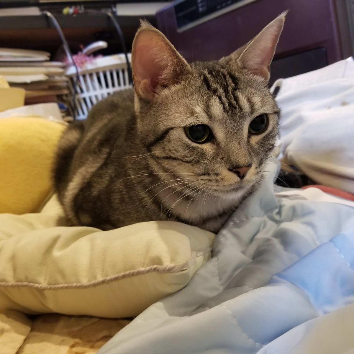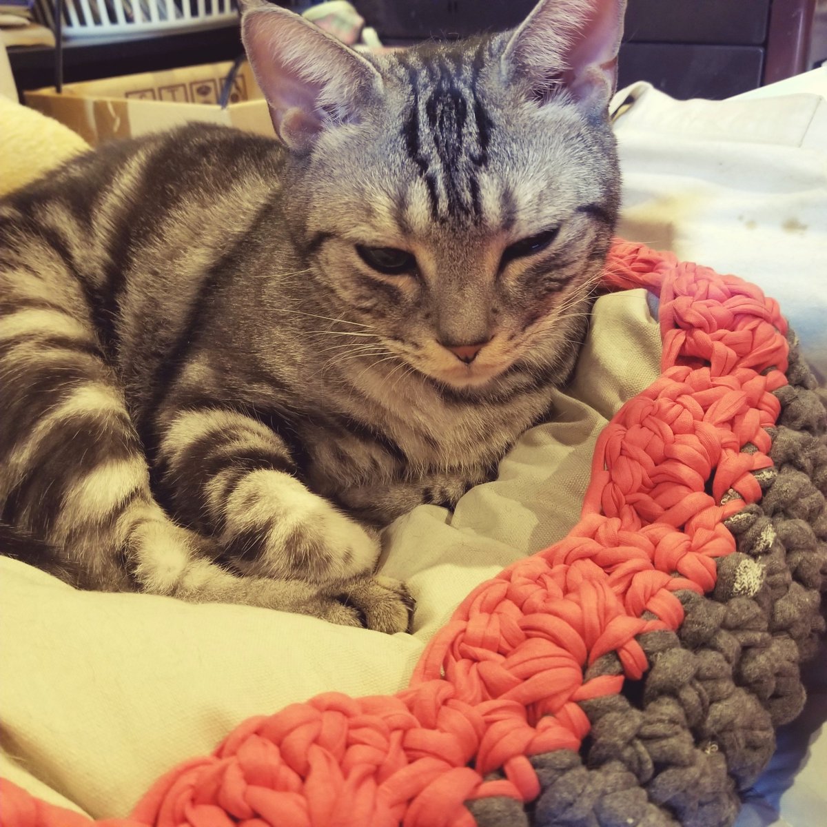 2024-9-9(Mon) 03:10:29 2 pics #TL #twitter #TLに猫を流しちゃおう 先日買ったTシャツヤーンで猫ベッド作成。歪みや大きすぎた感もありますが味と言い切る😁猫は警戒し… 投稿を見る